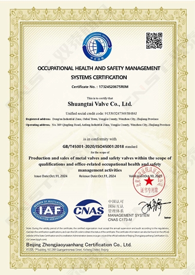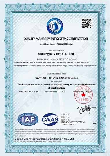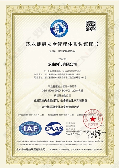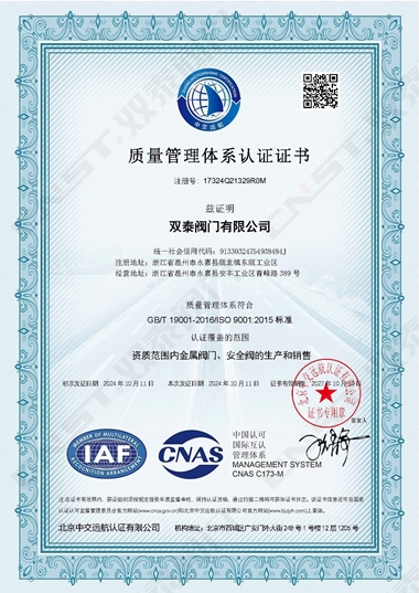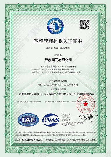 2024年10月,雙泰閥門有限公司更新資質(zhì)通過ISO9001質(zhì)量管理體系認(rèn)證、ISO14001環(huán)境管理體系認(rèn)證、ISO45001職業(yè)健康安全管理體系認(rèn)證。是獲得安全生產(chǎn)標(biāo)準(zhǔn)化達(dá)標(biāo)企業(yè)以來在管理方面的又一重大突破,標(biāo)志著工廠在管理水平方面再上一個(gè)新的臺(tái)階,并對(duì)提高公司的市場(chǎng)競(jìng)爭(zhēng)力和品牌影響力有著重要的作用。對(duì)提高企業(yè)綜合管理水平,提升品牌美譽(yù)度,彰顯社會(huì)責(zé)任,降低環(huán)境風(fēng)險(xiǎn),起到重要的作用。